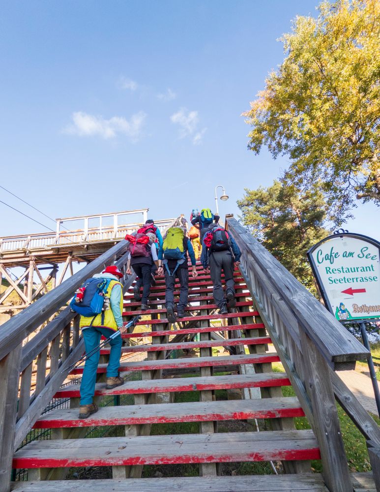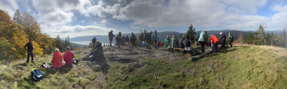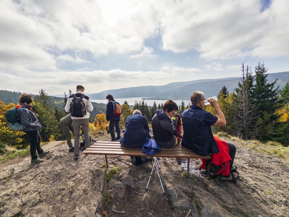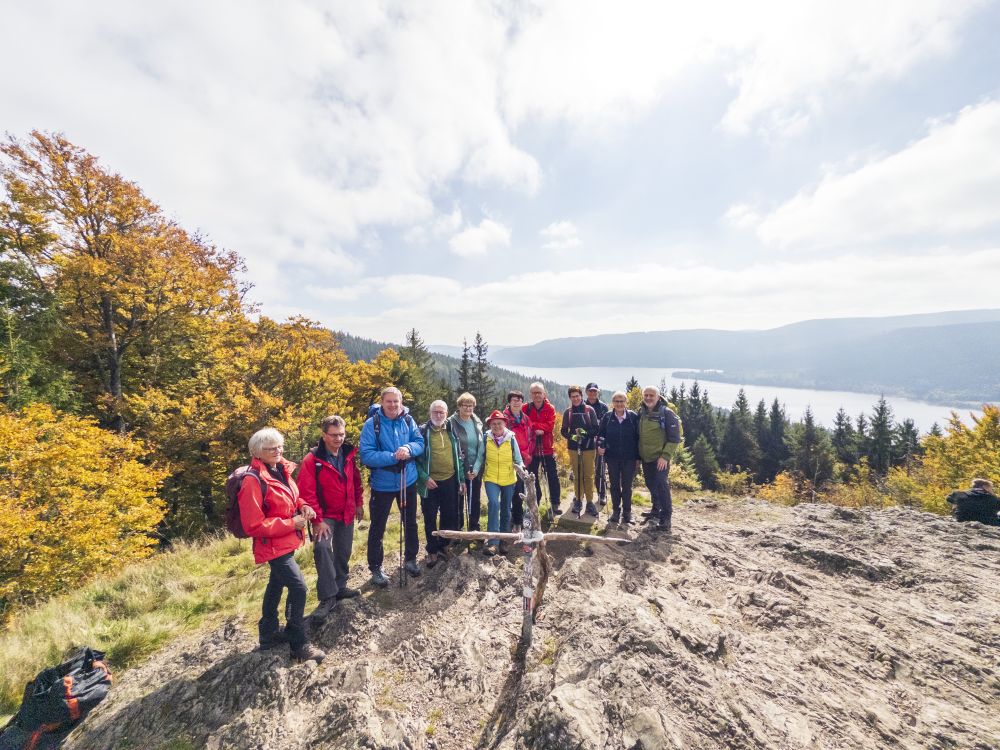 Am vergangenen Sonntag fanden sich dreizehn Teilnehmer des Schwarzwaldvereins Wolfach ein, um mit Wanderführer Thomas Gudelius den Premiumwanderweg „Jägersteig“ am Schluchsee zu wandern. Und diese erlebten vorweggenommen einen Traumtag im herbstlichen Hochschwarzwald. Bereits auf der Anfahrt zeichnete sich ab, dass der Wettergott es gut mit den Wolfachern meinte. Lediglich bei der Durchfahrt von Furtwangen herrschte Nebel, ansonsten schien nur die Sonne. Vom Parkplatz im Wolfsgrund aus waren es in Schluchsee nur wenige Meter bis zum Einstiegsportal auf der anderen Straßenseite, wo der Weg zunächst durch Bannwald auf dem alten „Jägerpfad“ hinauf zum Ahaberg und dann weiter auf dem historischen “Grenzweg“ zum Highlight der Tour, dem Aussichtspunkt Bildstein führte. Hier bot sich den Teilnehmern nicht nur ein atemberaubender Blick auf und über den Schluchsee und den Südschwarzwald, sondern fand auch die wohlverdiente Vesperpause statt. Der Weiterweg erfolgte über einen schmalen Pfad nach Unteraha. Da man gut in der Zeit lag, kehrte man im Seglerhof in der Gartenwirtschaft auf Kaffee und Kuchen ein und genoss das tolle Herbstwetter. Vorbei am Bootsanlegersteg ging es dann entlang des Schluchsees auf dem Seerundweg bis zur Amalienruhe, wo der Wanderführer noch etwas zur Entwicklung vom ursprünglichen, eiszeitlichen Gletschersee bis hin zur höchstgelegenen Talsperre Deutschlands zu erzählen wusste. Nur wenige Minuten danach erreichte man den Ausgangspunkt, um auf dem Rückweg mit der Schlusseinkehr in der Kalten Herberge einen tollen Tag ausklingen zu lassen.