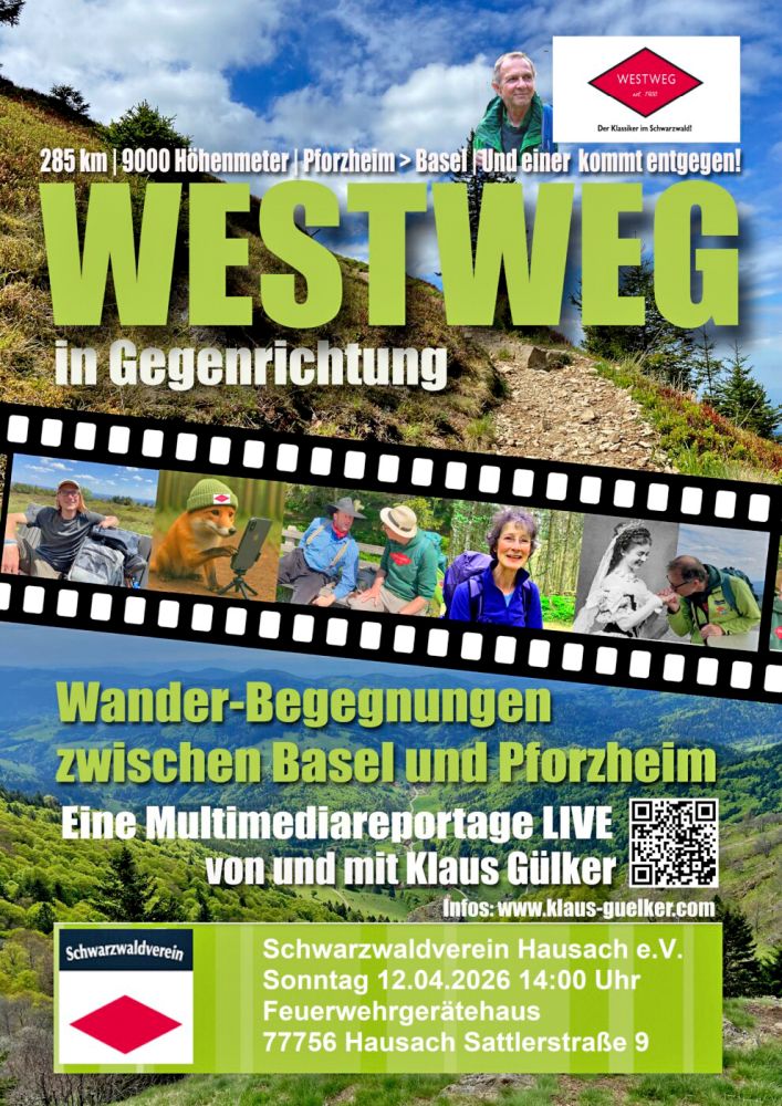 Nun kommt der Westweg in den Saal. Aus vielen schönen Bildern und kleinen Videoclips ist eine unterhaltsame Multimediareportage entstanden. Live erzählt er darüber am Sonntag, 12. April 2026, im Feuerwehrgerätehaus Hausach auf Einladung des Schwarzwaldvereins Hausach. Beginn der Reportage ist um 14:00 Uhr.