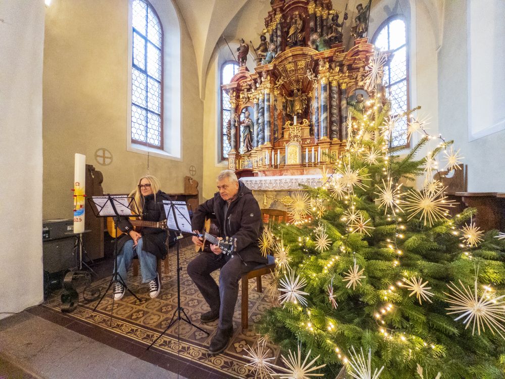 90 Besucher in St. Jakob bei besinnlicher Weihnachtsfeier. Anschließend Glühwein, Kinderpunsch und Weihnachtsbrödle am Flößerschuppen.