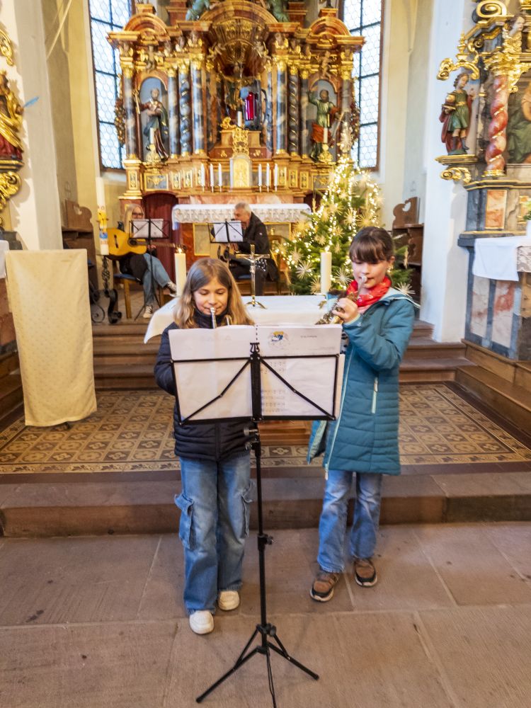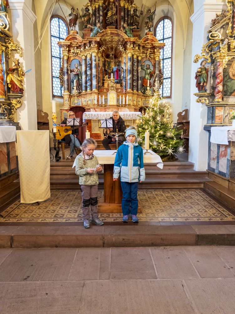 Marion Rauber und Arnold Grießbaum begleiteten die Weihnachtslieder gekonnt mit wunderschönem Spiel auf Ihren Gitarren. Die Blechbläser Leo, Enrique, Paul und Samuel füllten mit Ihren Instrumenten den Kirchenraum bei zwei Stücken aus; ebenso das junge Blechbläserduett Clara und Lene, die auch noch eine kurze Geschichte vortrugen. Herzallerliebst das Gedicht, welches von Marieke und Gwendolin vorgetragen wurde. Wie jedes Jahr beendete das mehrsprachige „Feliz Navidad“ das kurzweilige Programm der besinnlichen Weihnachtsfeier, unter wiederholtem großen Beifall der Besucher.